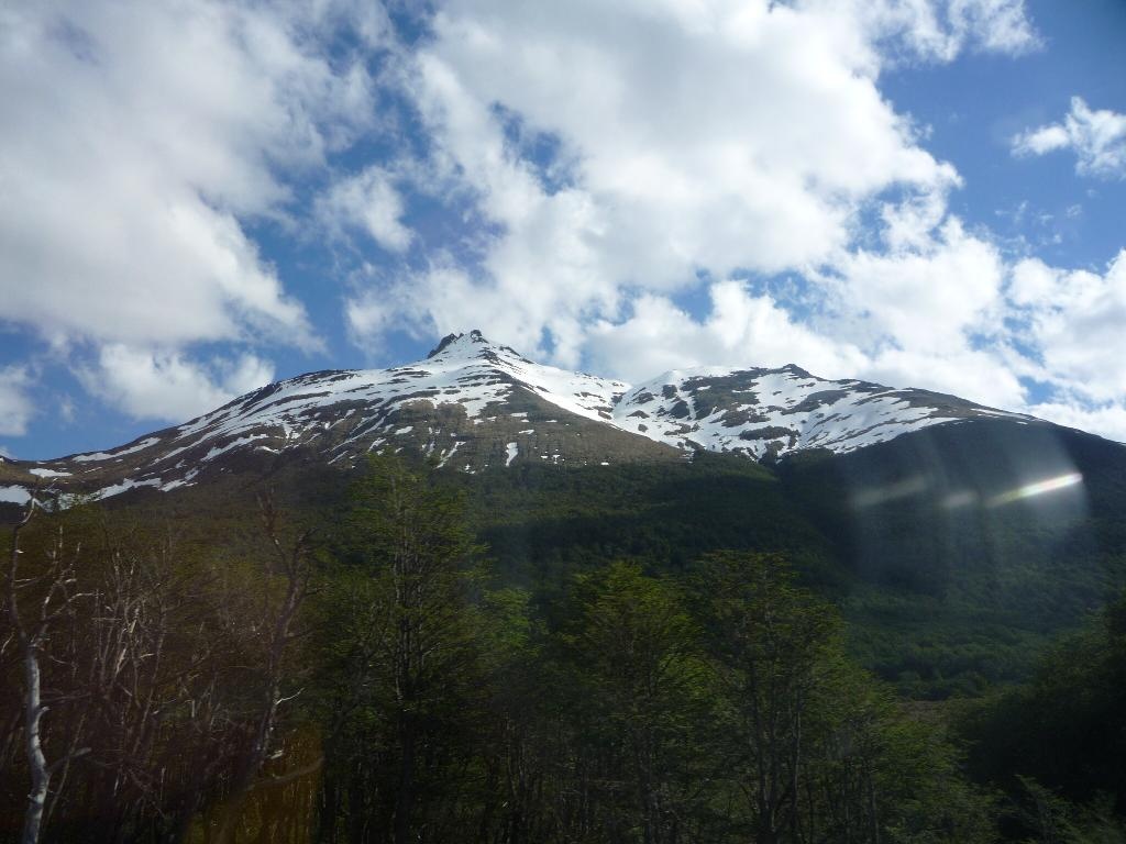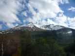 Kurz vor dem Ziel ein Blick aus dem Busfenster: weisse Berge und grüne Wälder